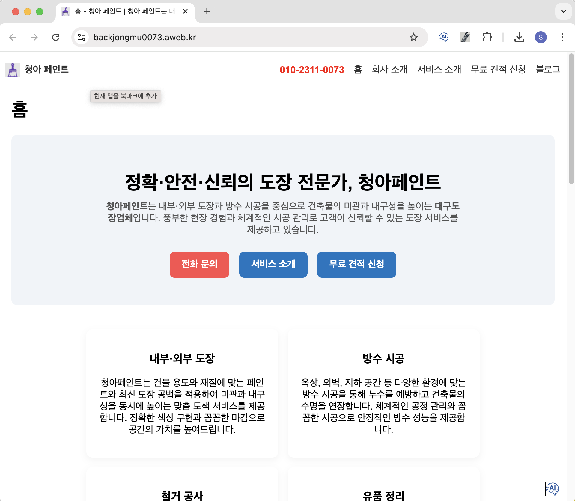 서브도메인 무료 제공 (xxx.mumeu.co.kr), 청아 페인트 홈페이지 예